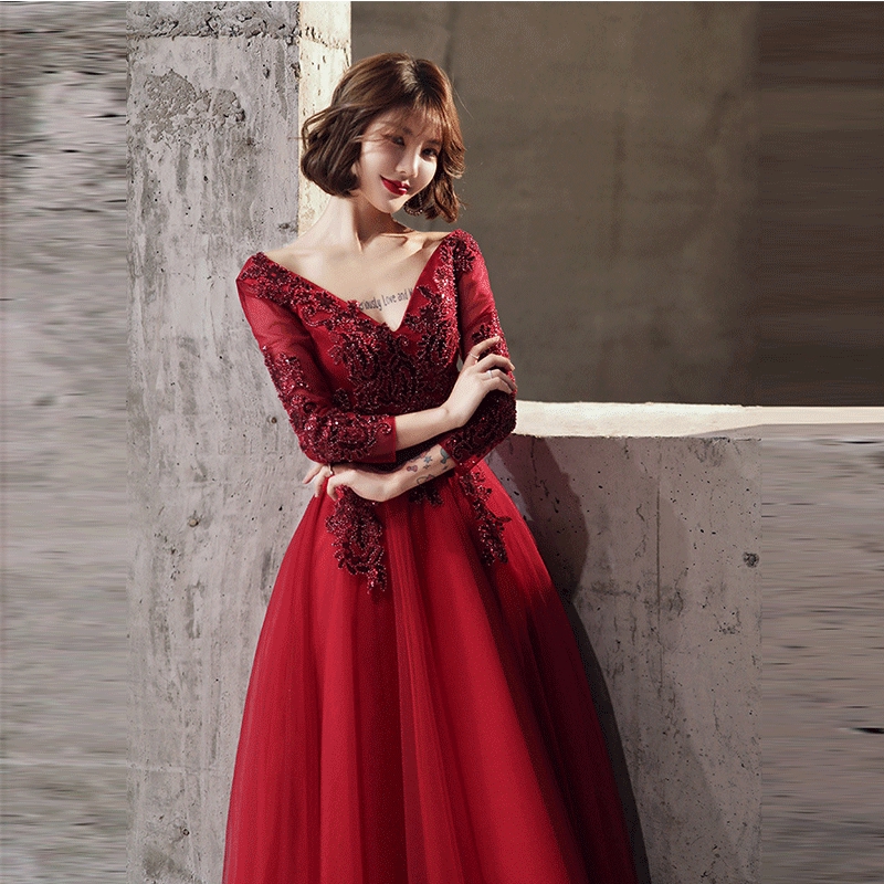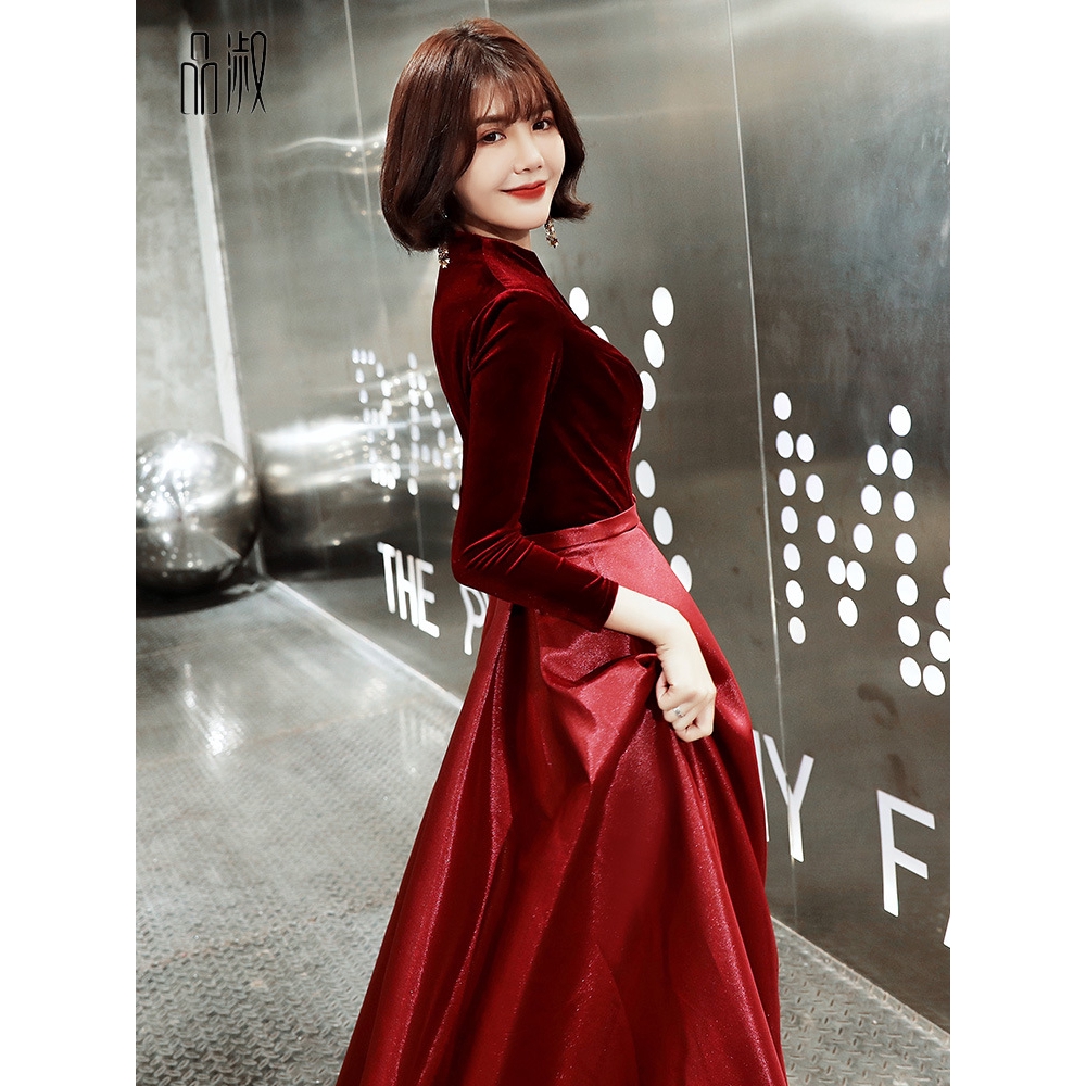 Toast To The Bride Long Sleeve Temperament Wine Red Wedding Dress Engagement Show Thin Long Evening Dress Female Shopee Malaysia